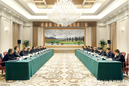 12月4日,自治区党委书记陈小江、自治区主席艾尔肯·吐尼亚孜在乌鲁木齐会见中国中铁股份有限公司董事长陈文健一行。石榴云/新疆日报记者 谢龙摄