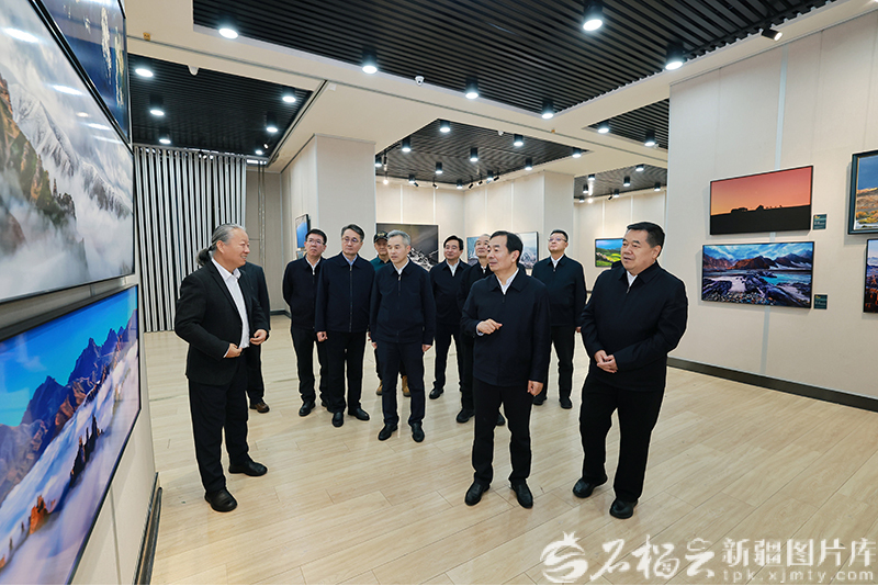 1月9日,自治区党委书记陈小江在自治区文联,参观新疆风光摄影展并与摄影师亲切交流。石榴云/新疆日报记者 崔志坚摄
