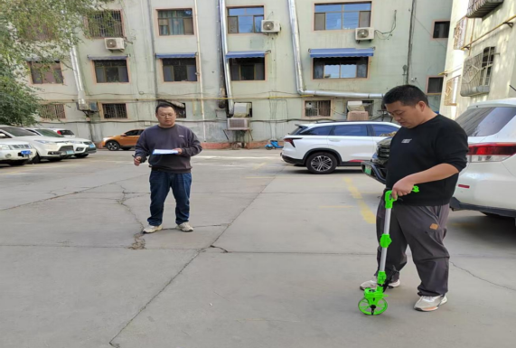 (图片二:审计组用测距仪现场测量小区地面硬化面积)