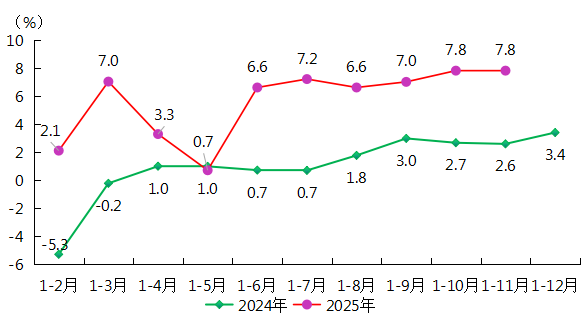 地方规模以上工业实现增加值同比增长7.8%,其中,煤炭开采和洗选业增加值增长10.1%,电力热力生产和供应业实现增加值增长0.3%(11月当月新能源生产增势良好,风力、太阳能发电量分别增长73.4%和98.6%),黑色金属矿采选业增加值增长10.7%,有色金属矿采选业增加值增长16.6%。