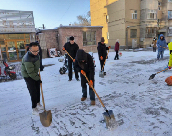 在扫雪现场,干部职工们不畏严寒,手持铁锹、雪推板、扫帚等工具,对辖区内主干道、居民楼出入口等重点区域的积雪进行集中清理。大家分工明确、干劲十足,各环节衔接有序,高效推进清雪工作。